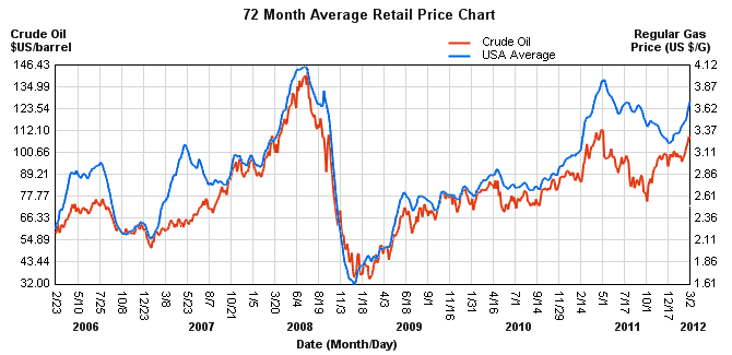 I managed to scrounge up a couple of charts tracking both the market price of oil and the retail price of gasoline over a six-year period. I re-scaled the data according to the big boom/bust cycle in 2008 which represented both the record high and record low of both products. This had the effect of making the rest of the chart track rather nicely between the two, with a couple of exceptions: