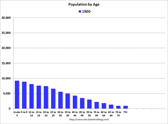 Over time, you can see that the focus of the age cohorts will shift so that the Baby Boomers will become less significant and the distribution will be much more flat overall. It's interesting to see how level the 2060 estimates are relative to the 1900 (with its massive amount of young children that never made it to adulthood).