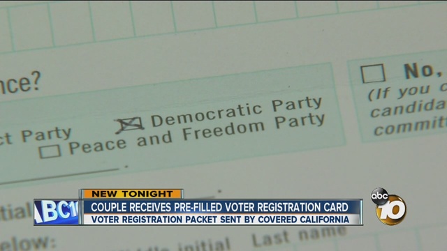 A local couple called 10News concerned after they received an envelope from the state's Obamacare website, Covered California. Inside was a letter discussing voter registration and a registration card pre-marked with an "x" in the box next to Democratic Party.