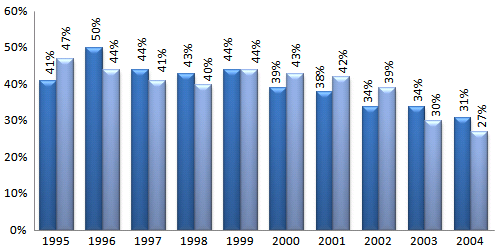 Of course, like the graduates of AMA colleges, the graduates of AOA colleges have also been increasingly choosing to enter specialty fields rather than primary care in recent years. Specifically, here's the percentage of students at AOA schools who claim that they intend to enter general practice: