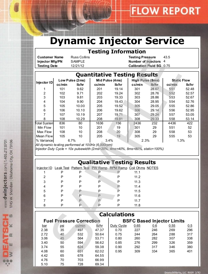 This test provides flow data over the low, middle, and high range of duty cycles for the injectors and give information about the minimum suggest pulse-width and maximum injector duty cycle.