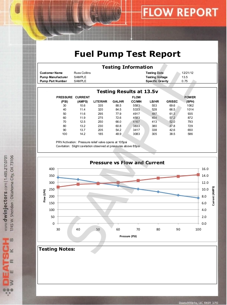 - DeatschWerks technicians who test hundreds of fuel pumps every month. We use our experience to make note of any noise, electrical abnormality, flow fluctuation, start-up hesitancy, or any other observed problem that could be important for you to know.