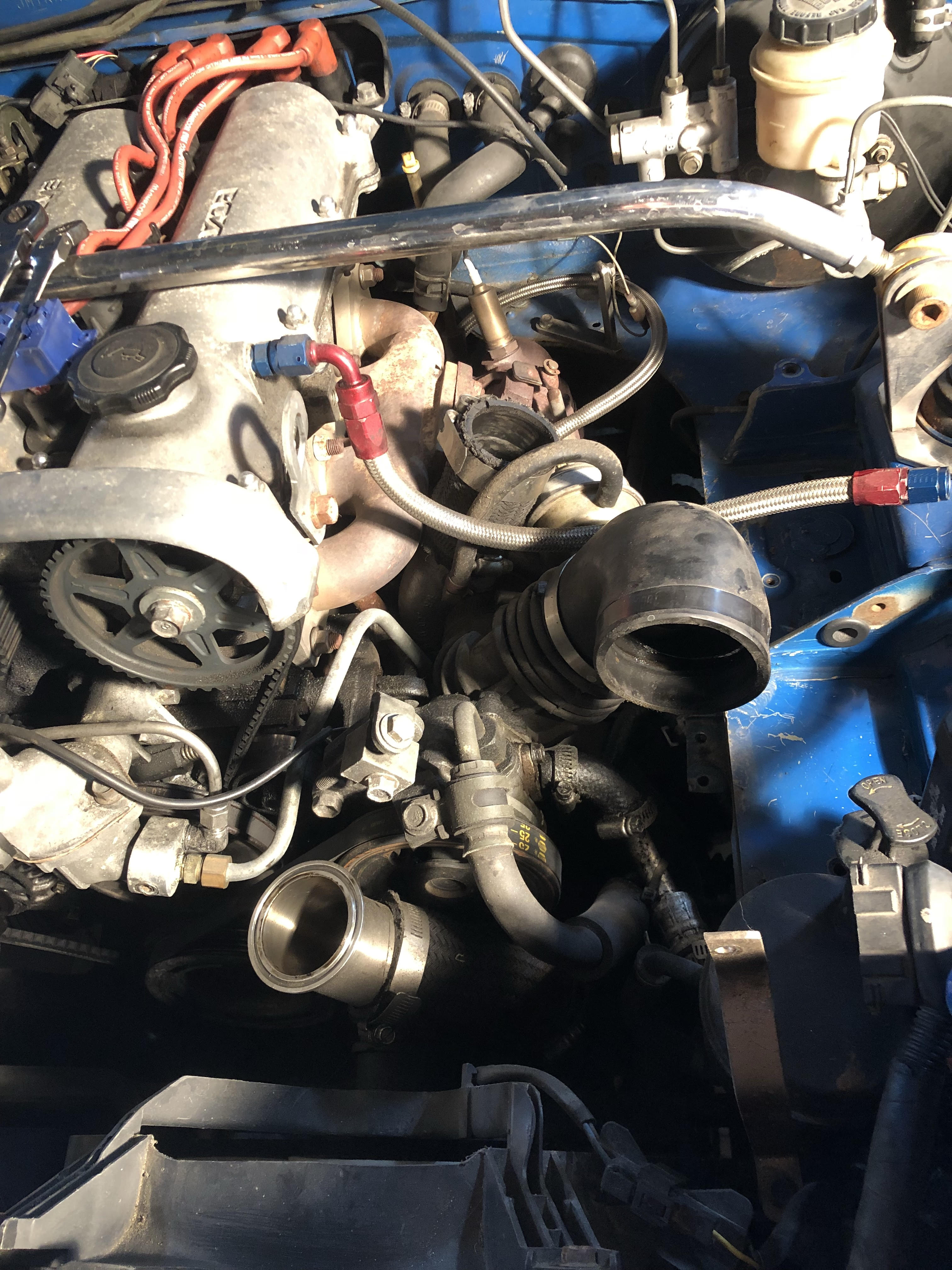 I was searching for a nice 1.8 to start a build with but came across this 1990 1.6 that I wound up buying because it was inexpensive. At some point it looks like someone spent a lot of time and energy creating brackets and welding up custom piping. It all appears well done. The car also has a nitrous system installed with a fogger in the intake, 10lb bottle in the trunk, WOT switch, MSD window switch and purge system. I plan to basically pull all that out and sell what I can to recoup some money. Right now the car is running on the stock computer and a FMU. There is a narrowband and boost gauge added to the a-pillar. I've already bought a AEM wideband to swap in early next week. It's boosting 3-4 PSI and the narrowband is almost always in the "rich" portion of the gauge unless I am steady state light throttle where it bounces back and fourth like normal. Car also has a 1.8 rear end, not sure if torsen.