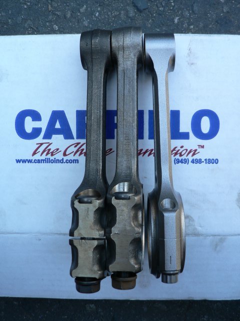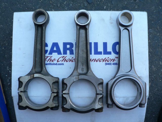 In the pictures below, the BP/1.8 rods are on the left, GTR rods in the middle, and Carillo A beam rods on the right.
