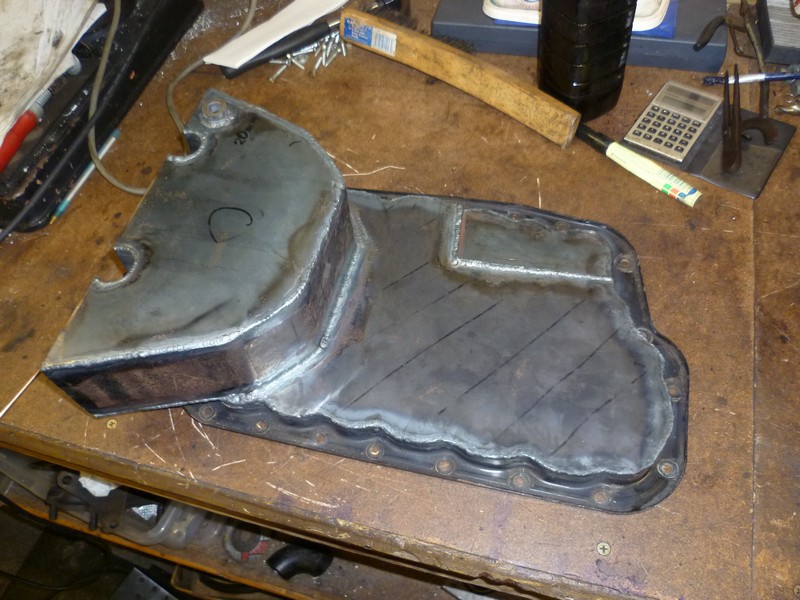 The shallowest part is to clear the power steering rack. The sump looks to hold about 2.5L or thereabouts, I think with the oil cooler and remote oil filter that should give me enough oil capacity.
