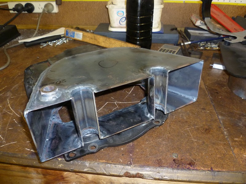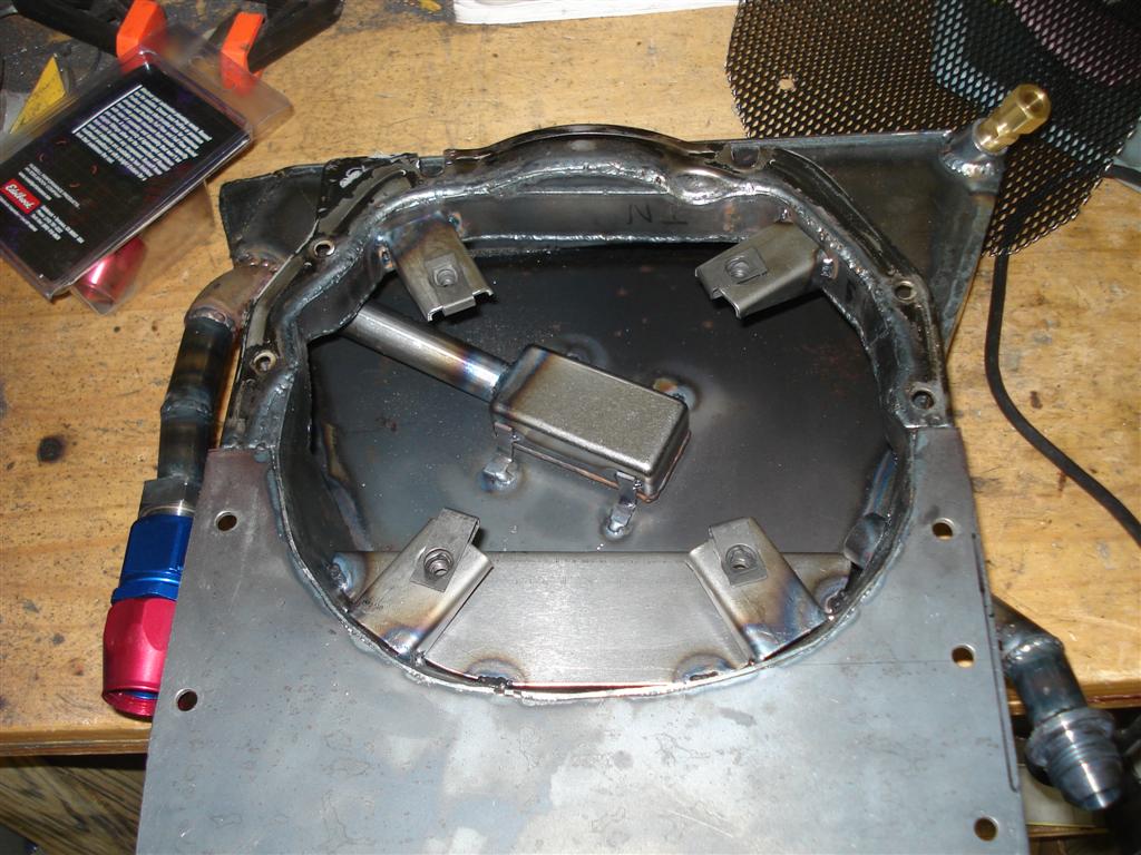 I still have to weld on the inlet -12AN inlet fitting for the oil pump. And drill a few holes larger...