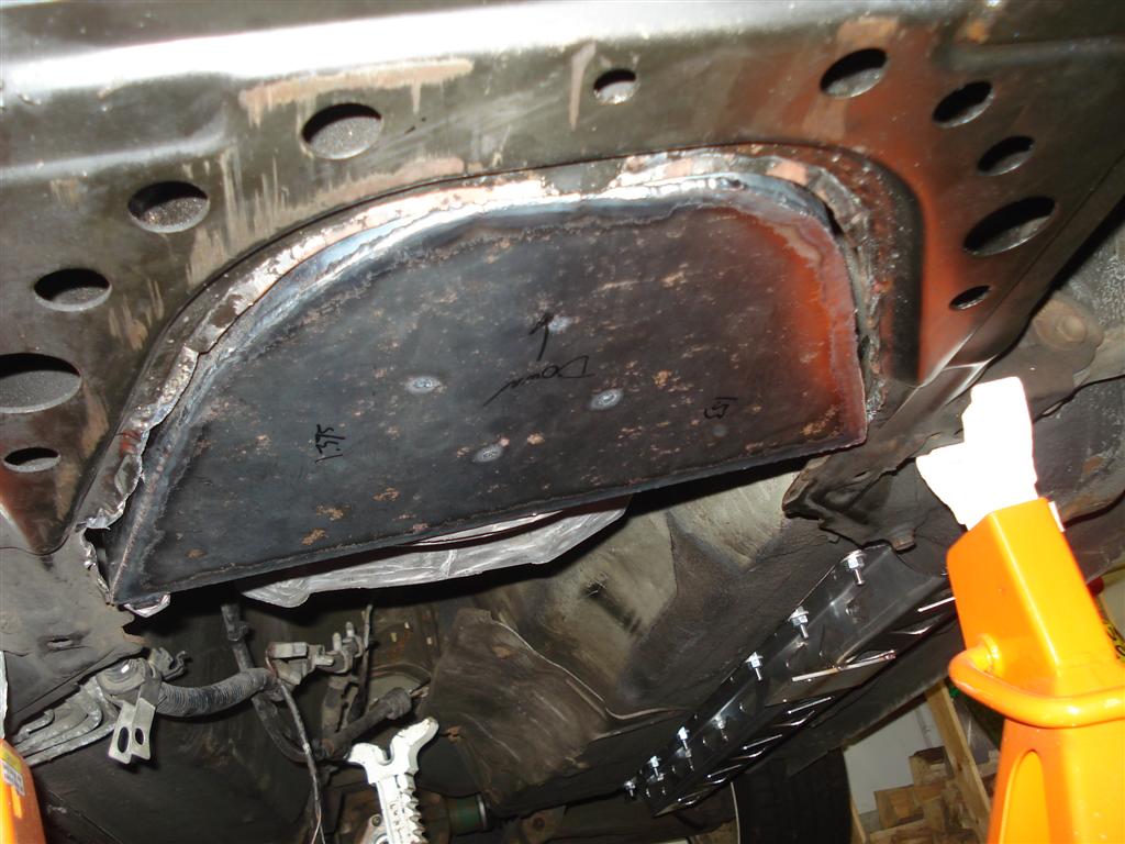 I made it follow & clear the subframe shape by 1/4", then hammered as much of the subframe for extra clearance as I could. The hard/thick parts I ground down. I still have to clean this up once it's on a lift so I have more room.