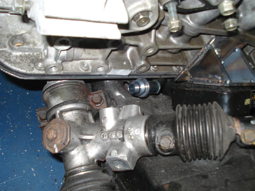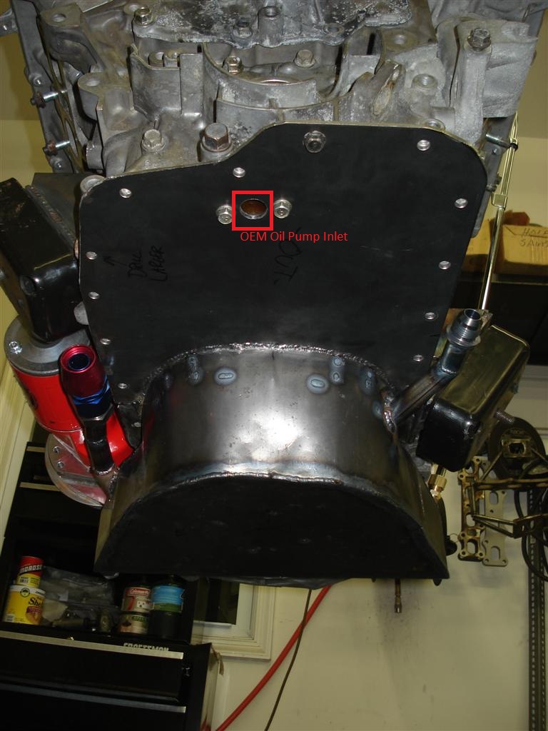 The external sump pipe is going to be connected to the input to the OEM oil pump via a small section of hose. I ran it externally because in order to keep it all inside the pan a very tight bend must be done at the pump inlet. The other's with KL swaps do it that way. When I saw that the pump inlet flange was on the same plane as the oil pan rail, I figured life would be easier this way. Plus this let me slammered my engine for maximum intake manifold clearance so there isn't room for the pipe between the engine and steering rack, I have to go around the engine.