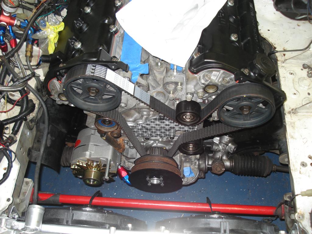 I have to paint that idler & tensioner...oops. Trackspeed Engineering 12tooth crank trigger wheel, 100amp single wire alternator mounted on the opposite side to give me more room for a downpipe on the driver's side. I made a nice bracket for the alternator earlier this week but it crashes into the header. Dammmit.