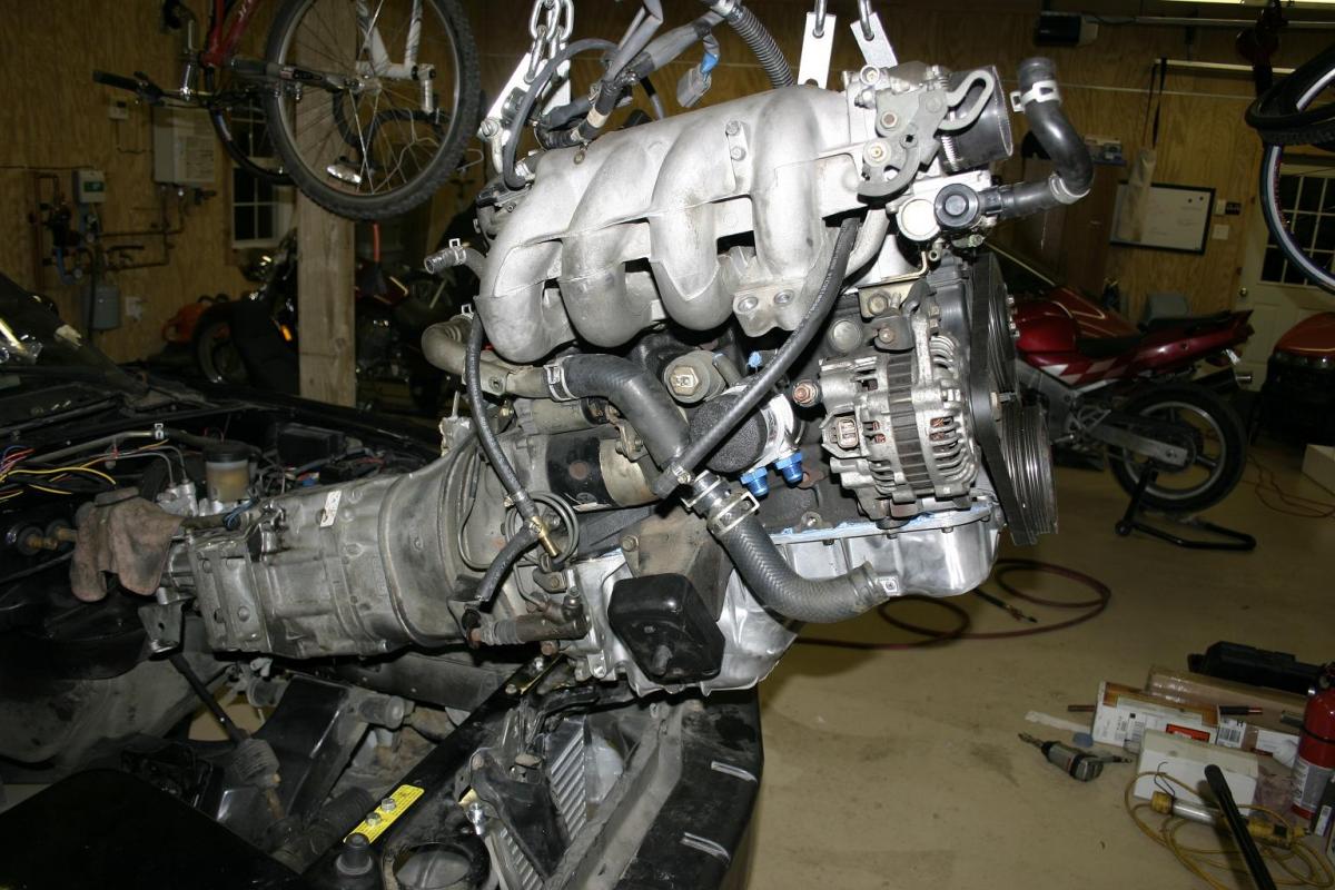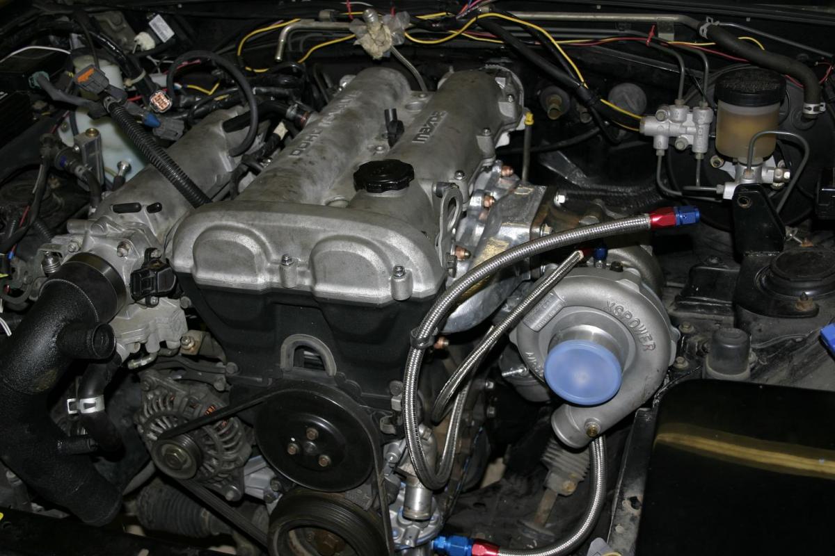 The 1.6 housing points to the right of the engine and a mis-mash of miata hoses carry the fluid to the radiator.