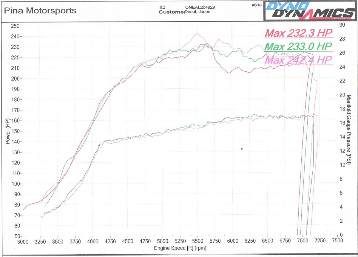 Thanks very much Jason! That is odd how it is breaking up and drops off at 5750-6000 RPM. Maybe in your timing map or your plugs? Just strange that the power doesn't match the plot of manifold pressure at all. As it seems you are boost creeping up to ~17 psi by redline, but not making any additional power past 5750... Odd. It does look like there is a lot more power potential that could be had from this turbocharger setup.