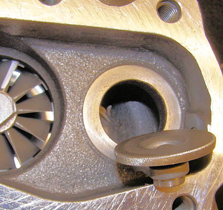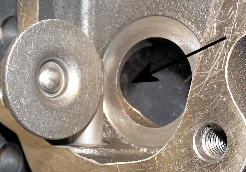 This image was taken looking through the exit side of the wastegate, back towards the exhaust flange (looking upstream). The arrow points at the area where the material was removed. You can see the resulting arc shape in the casting.