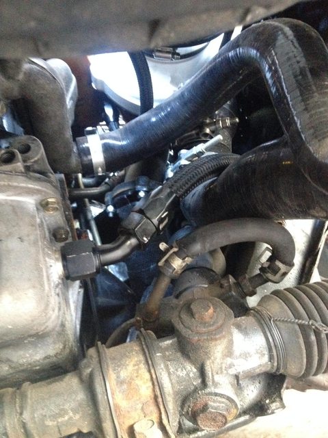 The oil looked fresh, but burn so im guessing its coming from the Turbo, which is a Godspeed GT2870. It has a 4AN SS oil feed coming from the back of the block, 2 6an SS water lines, and a 10 AN SS drain. Along with a restrictor feed on the top of the turbo