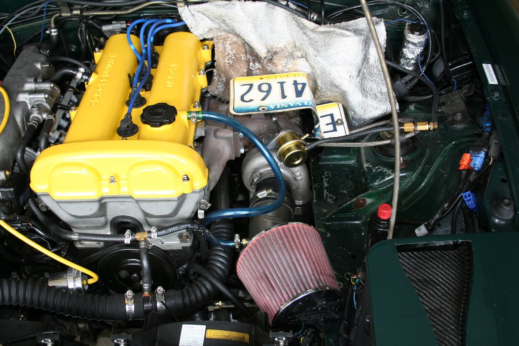 The replacement 1.6L engine no longer has a GReddy setup, but a BEGi manifold/DP with a MSP turbo (GT2554R). I figured that the new 1.8 will get the big power setup so decided to try something a little different on the 1.6. Few notes/observations below: