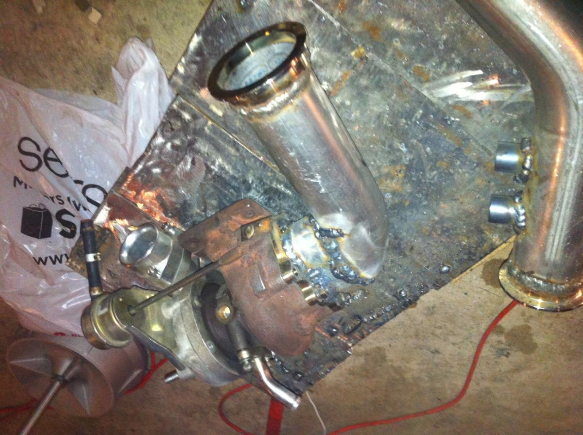 I accomplished quite a bit in the last week. The exhaust is done. I did have to add in a flex joint yesterday and ended up cutting the flex joint off my spare megan racing downpipe to make it work. I had to shorten the manifold since it was too long to fit the turbo in...even with it shortened I had to grind down a good bit of the sheet metal inside the engine bay to get it to work. Working on the downpipe now...I ended up welding in two o2 bungs. One o2 bung will be used to pressure test the exhaust using the new compressor I just got in over the weekend. How critical is it to resolve all your exhaust leaks? I'm mainly concerned about the manifold and everything else pre-02...I'm not sure of an effect leaks after the o2 sensor will have. I will use the same strategy to test the intake side and all the intercooler piping before startup via one of the vacuum ports on the intake.