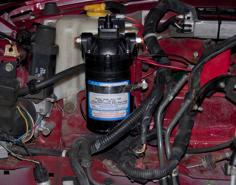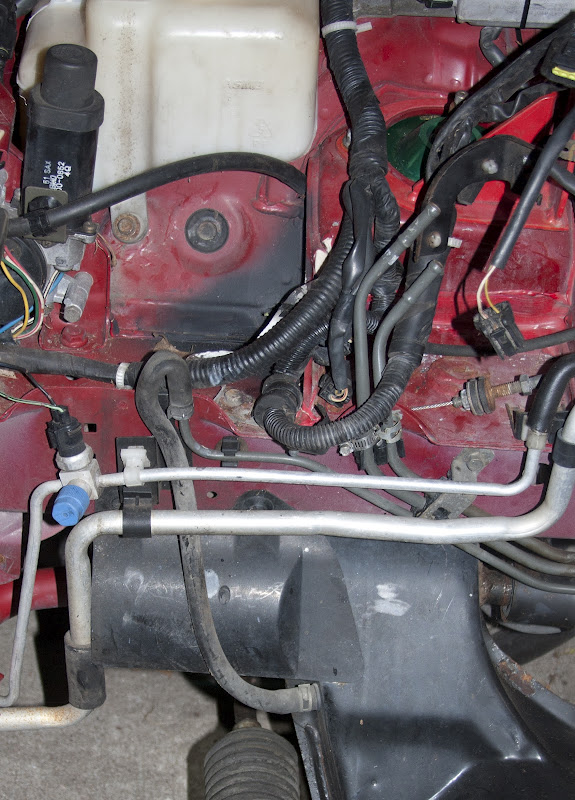 Removed the hard pipe and just looped from the subframe nipple to the hardline coming from the fuel tank, then reinstalled that charcoal can bracket to mount my water pump. Disregard the wiring mess, I haven't bothered to wire it yet. One day plan to use the abandoned purge valve wiring to control the water pump, but that'll have to wait for a better megasquirt.