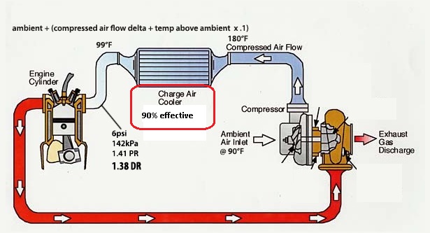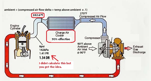 I'm suggesting on same day, with just different intake temps you might only lose 3% power from doubling the intake temps. You're still taking all that less dense air, then packing it back together after the intercooler, just not QUITE as well [3% less effective] because it's slightly warmer and more energized.