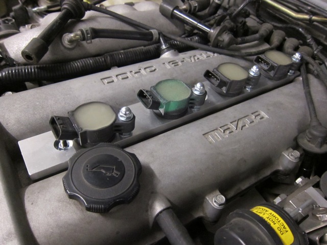 I picked up COPS from a V6 Toyota which are the longer style. I had my local machine shop make up a mount in aluminium which gives me lots of meat to work with for mounting the COPs in place. I made up a plug and play harness incorporating a dwell reducer (using Jason's circuit) which practically disappears from view unless you know what you're looking at.