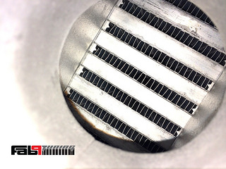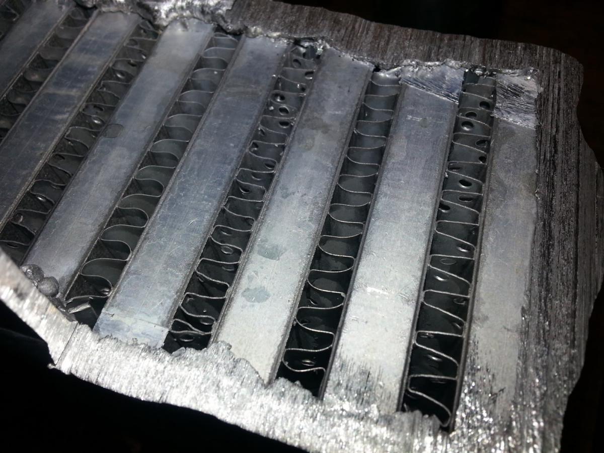 For comparison's sake, here's a sloppy CX racing intercooler I cut up to change the direction of one of the outlets. Notice how the turbulators arent as consistent, some are all bent up, and the welds are occasionally blobby.