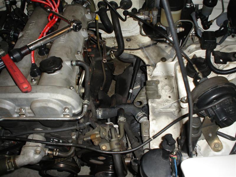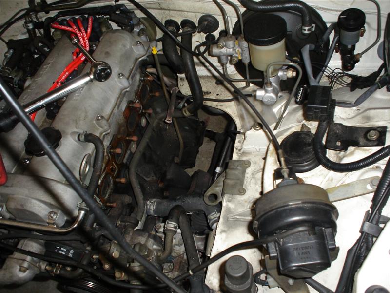 4--***TIP*** As you know the car is a 1995, everyone knows that on a 90-93, the oil feed is right under the headers on the block...some people talk about a 94 as well...typically its generalized as early 1.8's....1995 HAS THE SAME LOCATION FOR OIL FEED LINE AS 1990-93 CARS....It's almost impossible to see with the heatshield/headers on...If you have a 95 or older, you have your oil feed...96+ looks like the other side of the block..sorrry