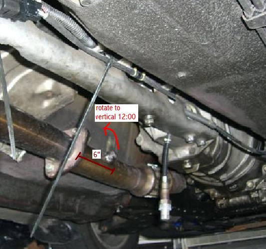 If it ends up being in front of the flex section, instead of behind, that's fine. 6" forward from the cat, facing between 12:00 vertical and 11:00 towards inward. Will leave plenty of room to set the sensor and a heat shield if needed.