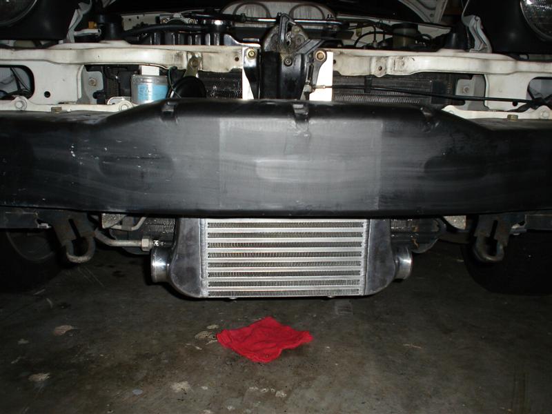I/C is installed. I "fabbed" up the brackets (aka cut, bent, and drilled holes...but hey fab is fab!). Took a lil bit to get them just right, but looks sweet, and solid. I think the hardest part was trying to get the height right. I think I finally have it, but I can always bring it up some if needed.