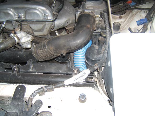 What do you get when you take a few feet of old pool hose, a 1.5 Dia. drill and a hack saw to your miata??? Well it gives the air box a nice shot of cold(er) air and looks something like this, and cost me absolutly nothing.