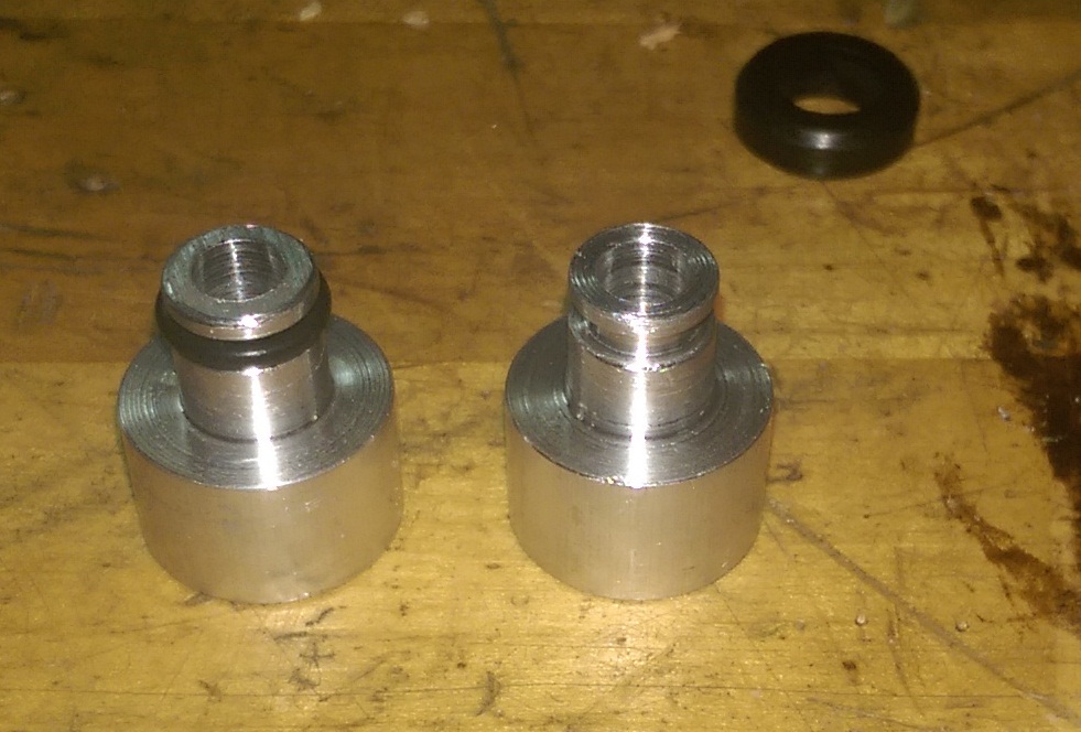 I had some ¾” round aluminum stock laying around so I figured I would try to make my own top hats, but you can find these for $40-50 bucks on Ebay. The EV14’s are a lot shorter than the old EV1’s, but by the time you open the lower opening of the hat to fit the EV14 (0.520”) and turn the upper portion to fit the miata fuel rail(0.410”) you end up with little or no material left in the transition area. Myfist one was made to exact same length as the old 1.6 injector I had laying around (from bottom donut to upper cushion seat). This left very little material and I ended up snapping the top off during trail installation, it was paper thin. I added about 0.100” to the length to add a little more material and it works great. I might have to add a thick washer on the fuel rail spacers or make new spacers.
