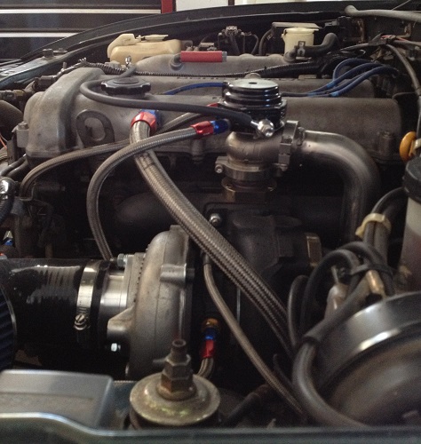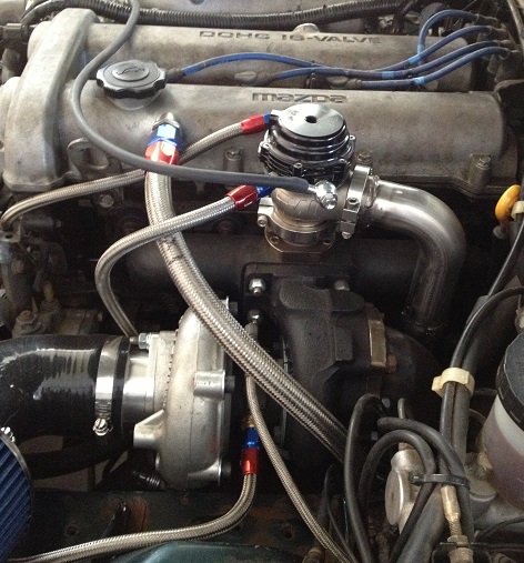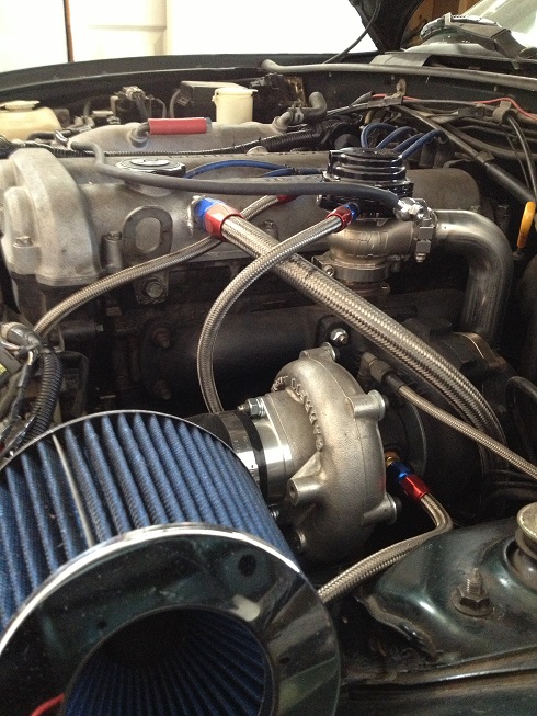 Here are some crappy Iphone pics of the setup mounted in the car and finished. I did all my water lines in -4 braided SS. The -10 braided line coming off my valve cover goes to the end of my DP to a slash cut. My PVC port on the valve cover is welded shut, and I welded a -10 male fitting where my breather tube was on the valve cover. The -4 cooling lines go from the supply to the EWG, then to the turbo CHRA, then back to the return. The dump tube is a 90* bend, goes down between the DP and the cast manifold, then turns like 25* and points straight down about 2" under the manifold where it vents to atmosphere. I did this cause to weld it to the DP would be a pain if I ever had to dismantle this setup, and I didn't want a whole lot of weight hanging off the side of the EWG. My turbine outlet is a 5 bolt GT28 outlet with the oval port design, I took a piece of 120* bend 3" SS tubing and cut it and smashed it flat to make an angled oval shape before I welded it to the flange. Then I cut it to be about as long as a FM turbine outlet, and welded a v band flange on it. I used my FM SS DP, but I cut the bolt flange off of that and welded a v band flange on it. I thought about making it all 1 piece from the turbo flange to the end of the DP, but if I ever need to take it apart, I simply undo a v band clamp instead of unbolting/ stripping/ snapping off studs. Another thing about my DP, it had 2 O2 ports on it. I used the upper one for my wideband, and the rear one I used a cut off wheel and made it disappear. This became my mounting hole to weld my slash cut to.