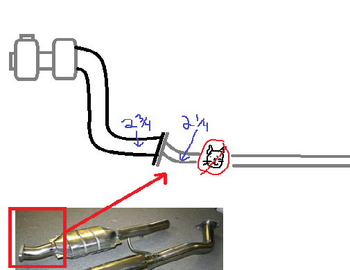 I recently deleted my cat, but the biggest issue is that right now my DP is 2.75" and the rest of my exhaust is 2.25", and there's no gradual reduction there. Just lots of gas bumping into my flange and trying to get into a smaller hole.
