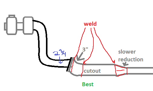 The BEST solution I can think of would be to get myself a small 3" mandrel, attach it to a flange on one end and then the cutout on the other, then get a gradual 3" => 2.25" pipe (either buy a pipe that does that, or pie cuts, or whatever) and attach that to the other end, and finally to the midpipe... but thats quite a few welds, and I like to KISS. Not to mention possible points of failure/not lining up, etc.
