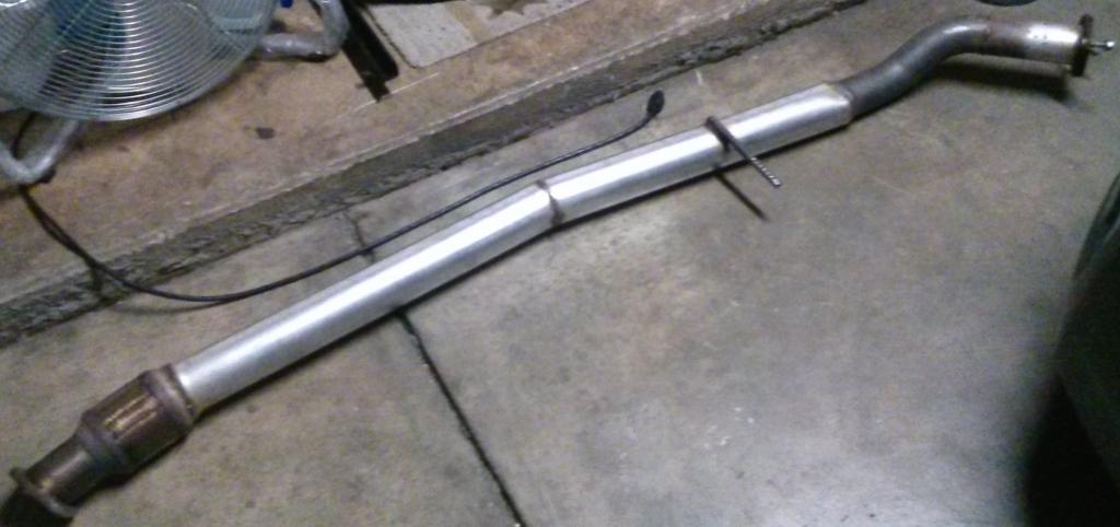 In all seriousness I can try to get pics when I get home, but it's just a BEGi downpipe and FM 2.25" exhaust, with a piece of pipe (2.5" with pie cuts down to 2.25" because that's all we had) in place of the cat.