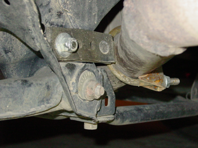 Here is a pic of the hanger that I used. You can see the rubber strap with holes and where I bolted it to the subframe. The hole in the subrame is already there. I cut off the excess strap. The strap is about 6" long originally. The bent metal tab that is riveted to the strap is captured by the muffler clamp. It is curved to capture the radius of the pipe. Sorry, but I live on a gravel road and the underside of my car is a mess from the mud.