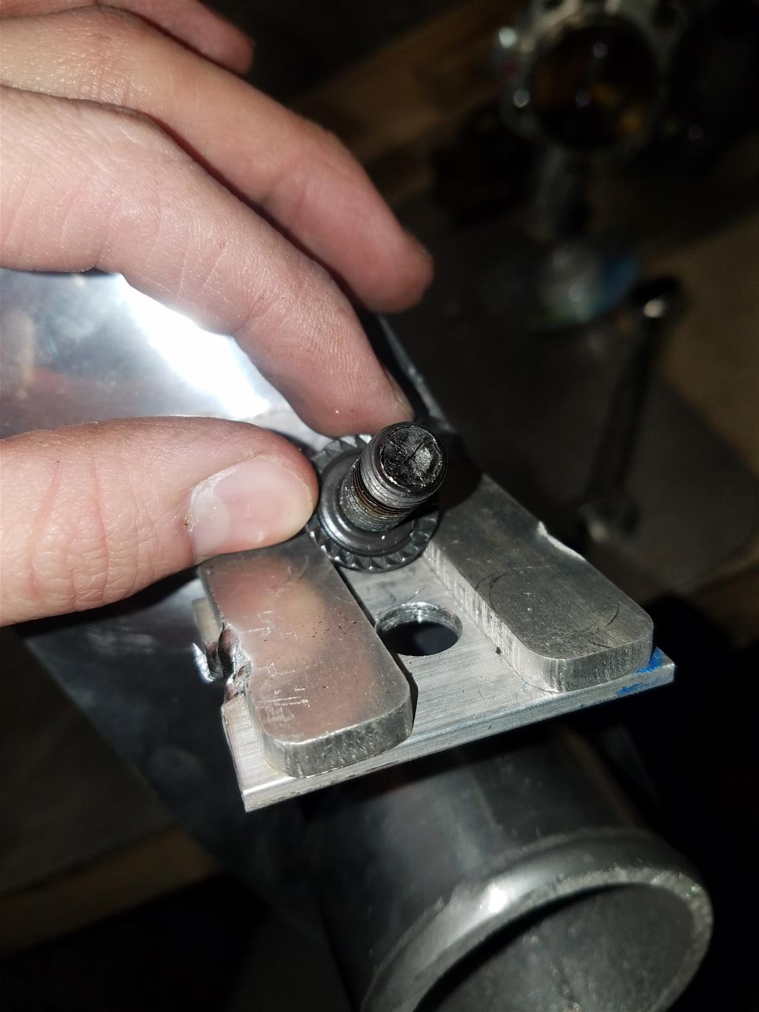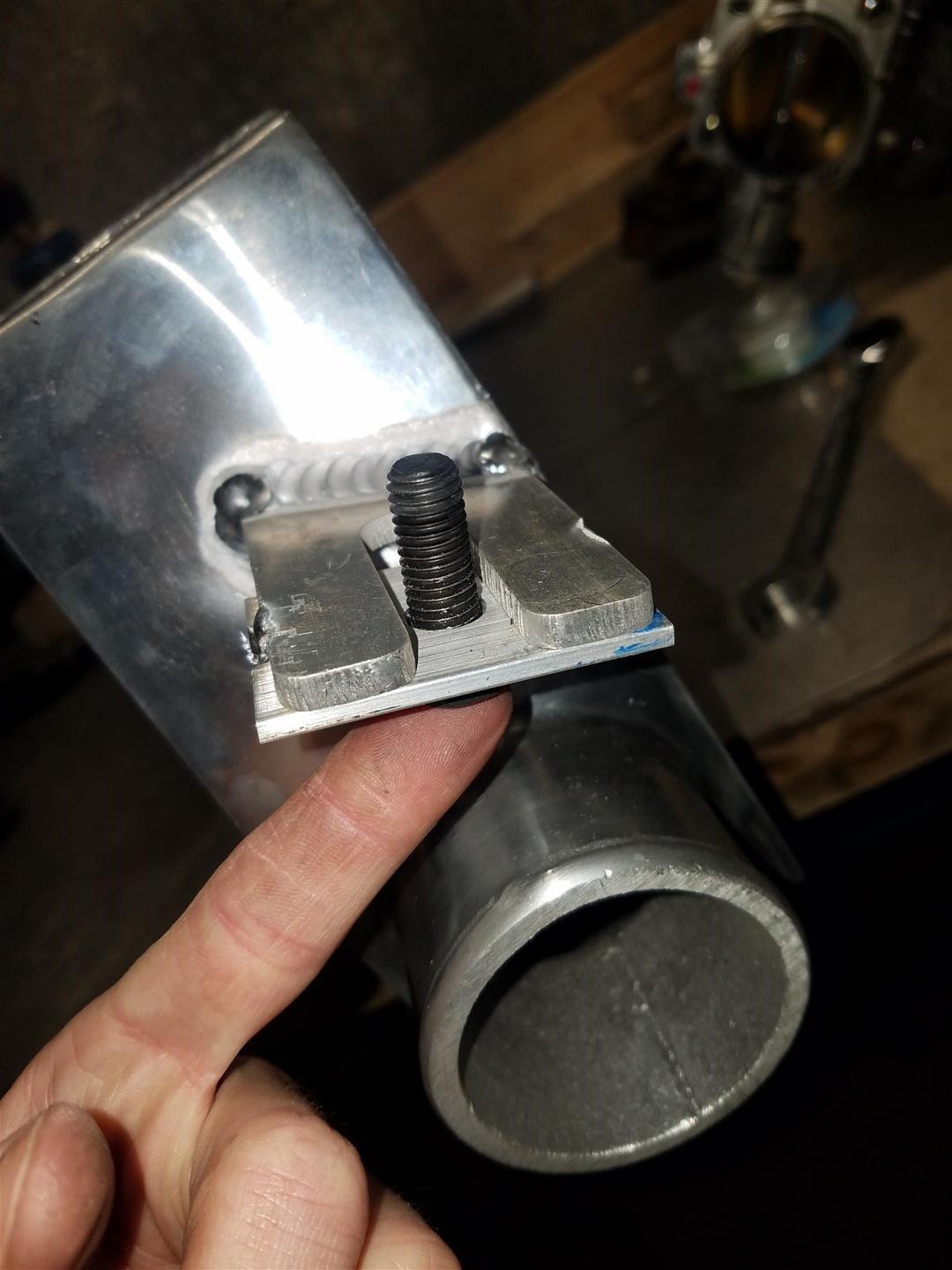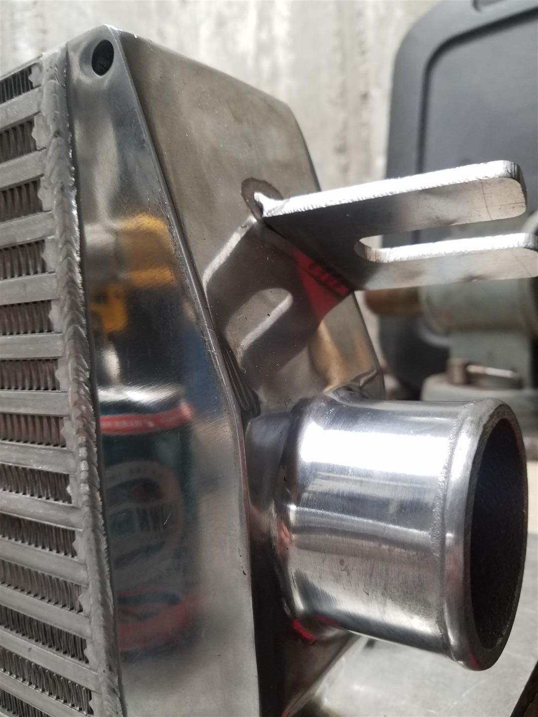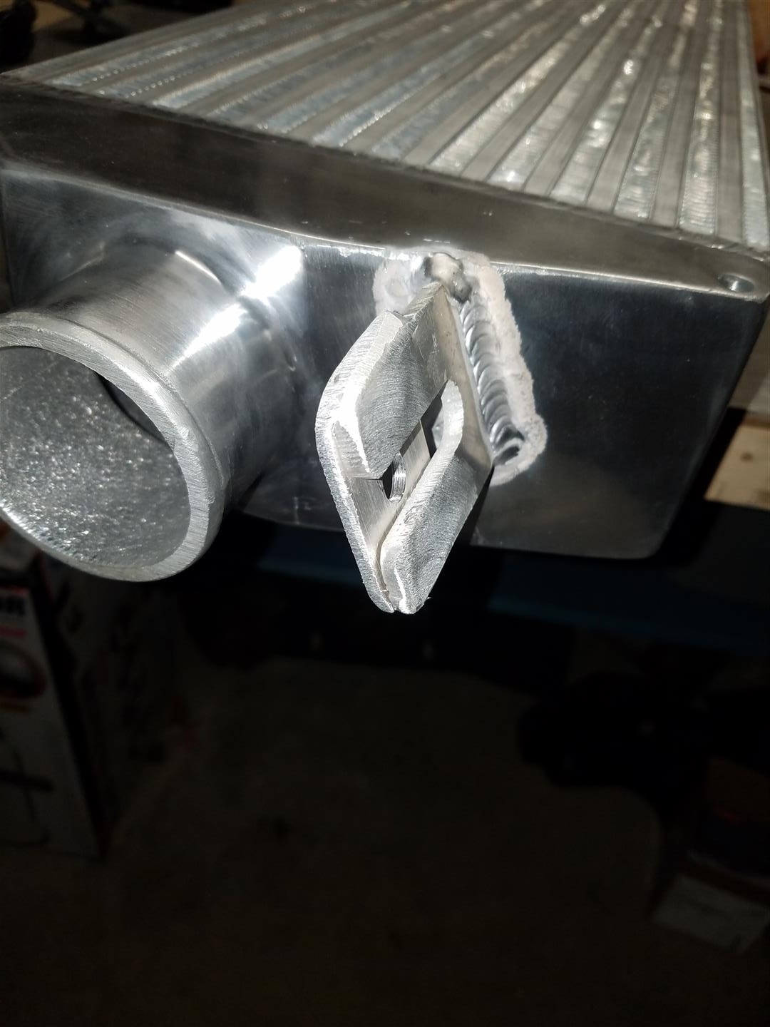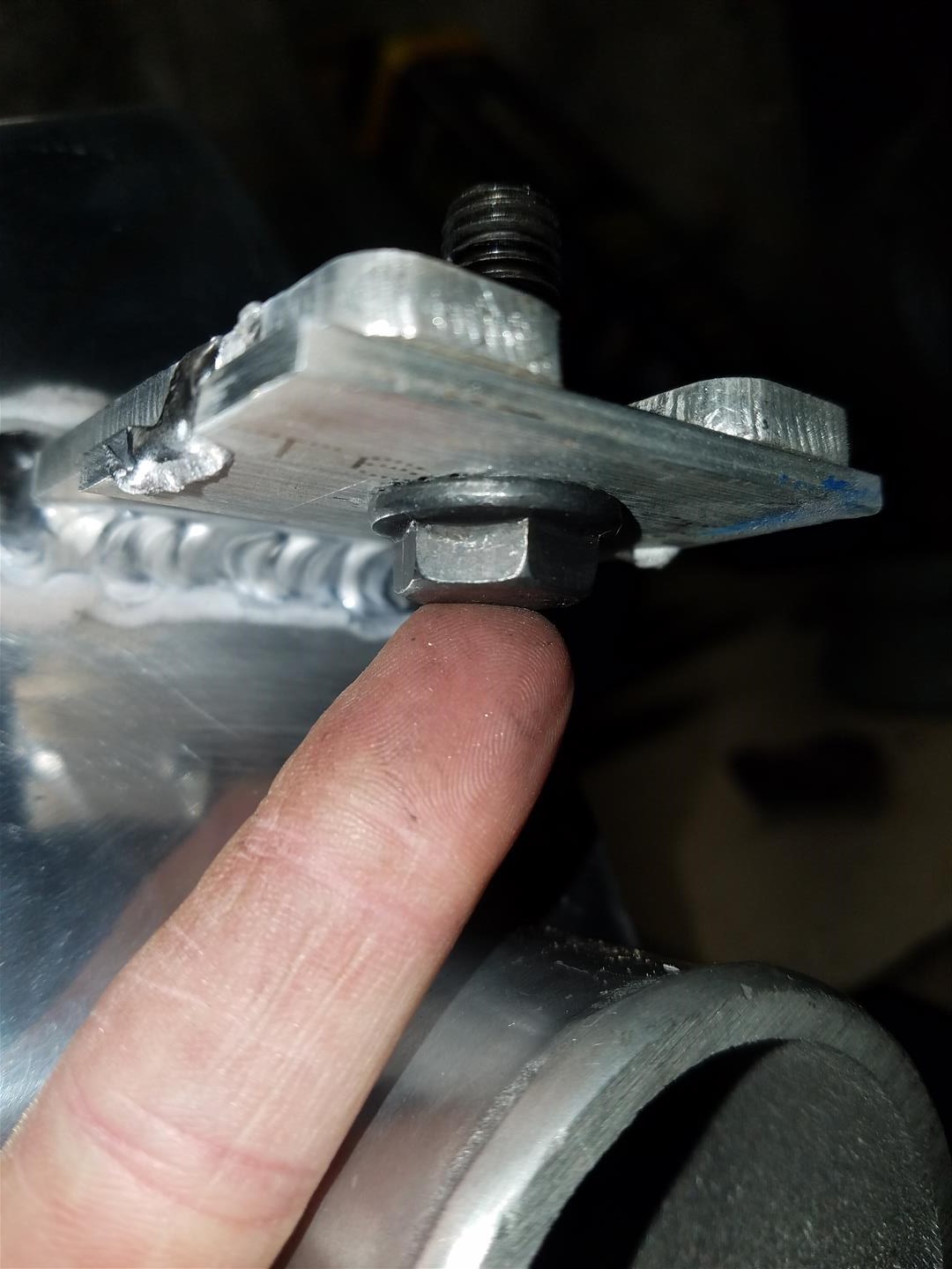 Ok, back to the I/C tabs, i didnt like how the slot was way to wide for my bolt and i needed to use a washer so the head had a good surface to mount to, and using washers with flange serrated bolts is just stupid and defeats the purpose, so cut up some aluminum "washers" and welded those onto the tabs.