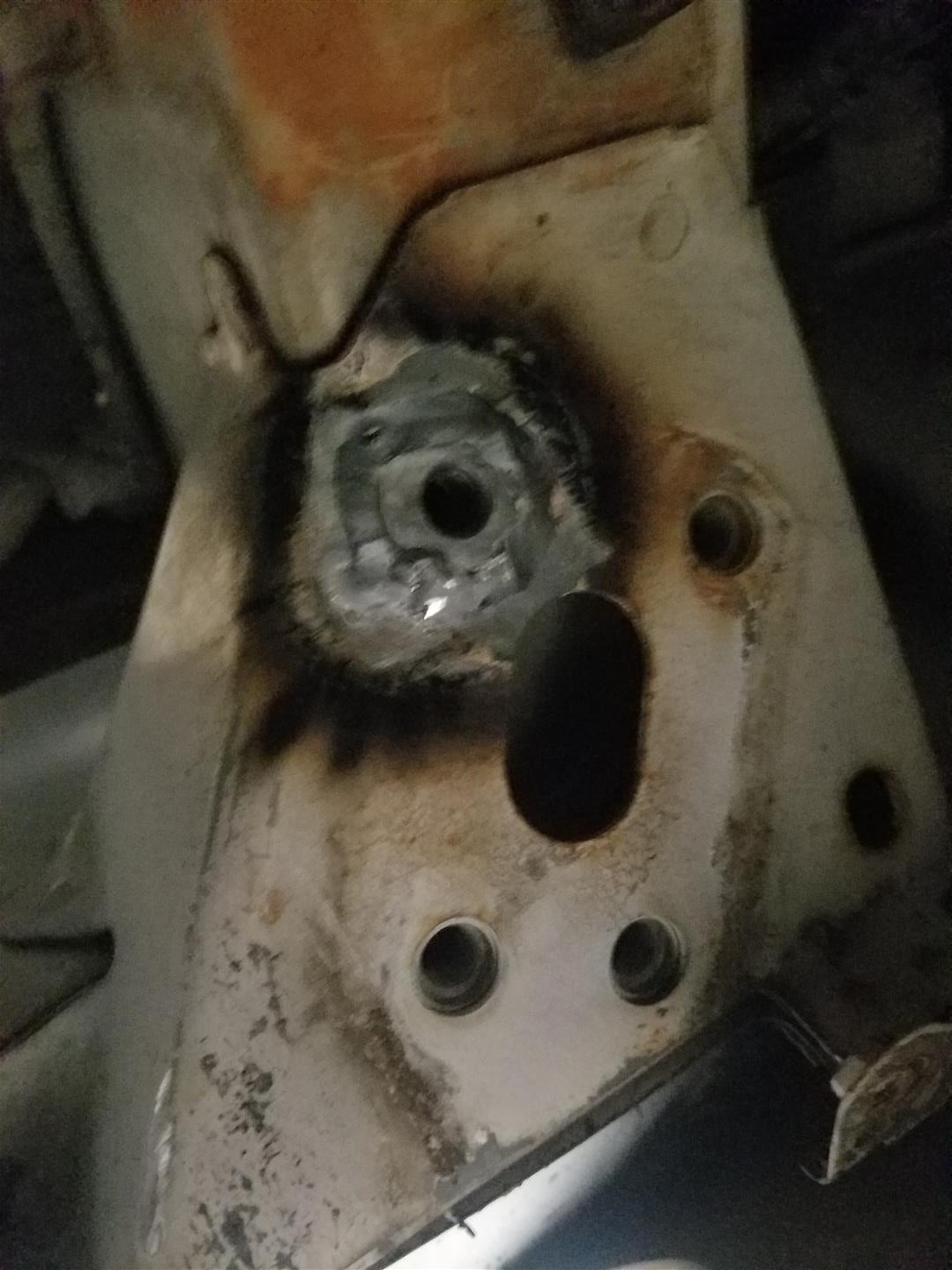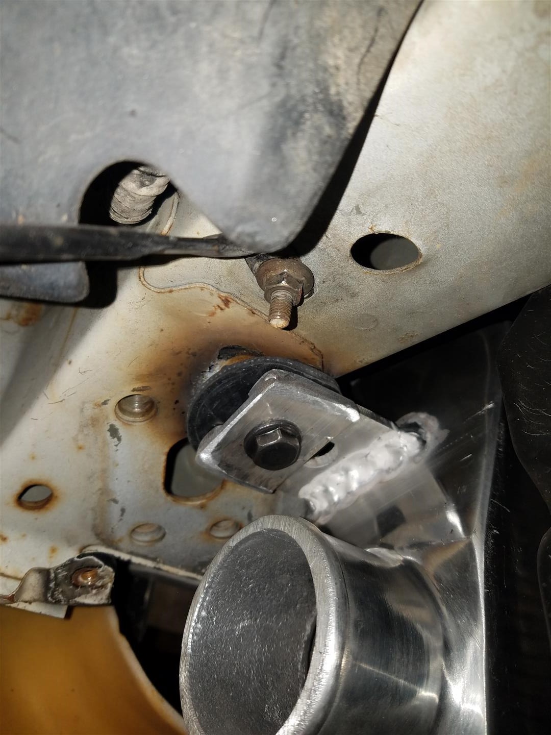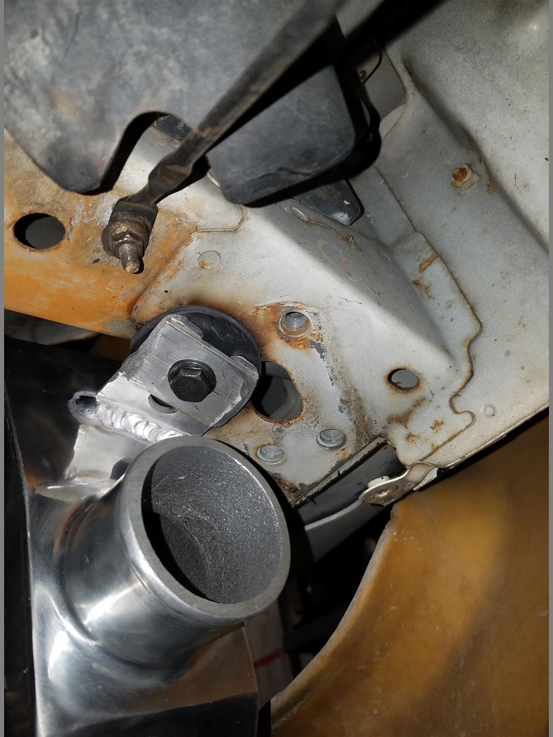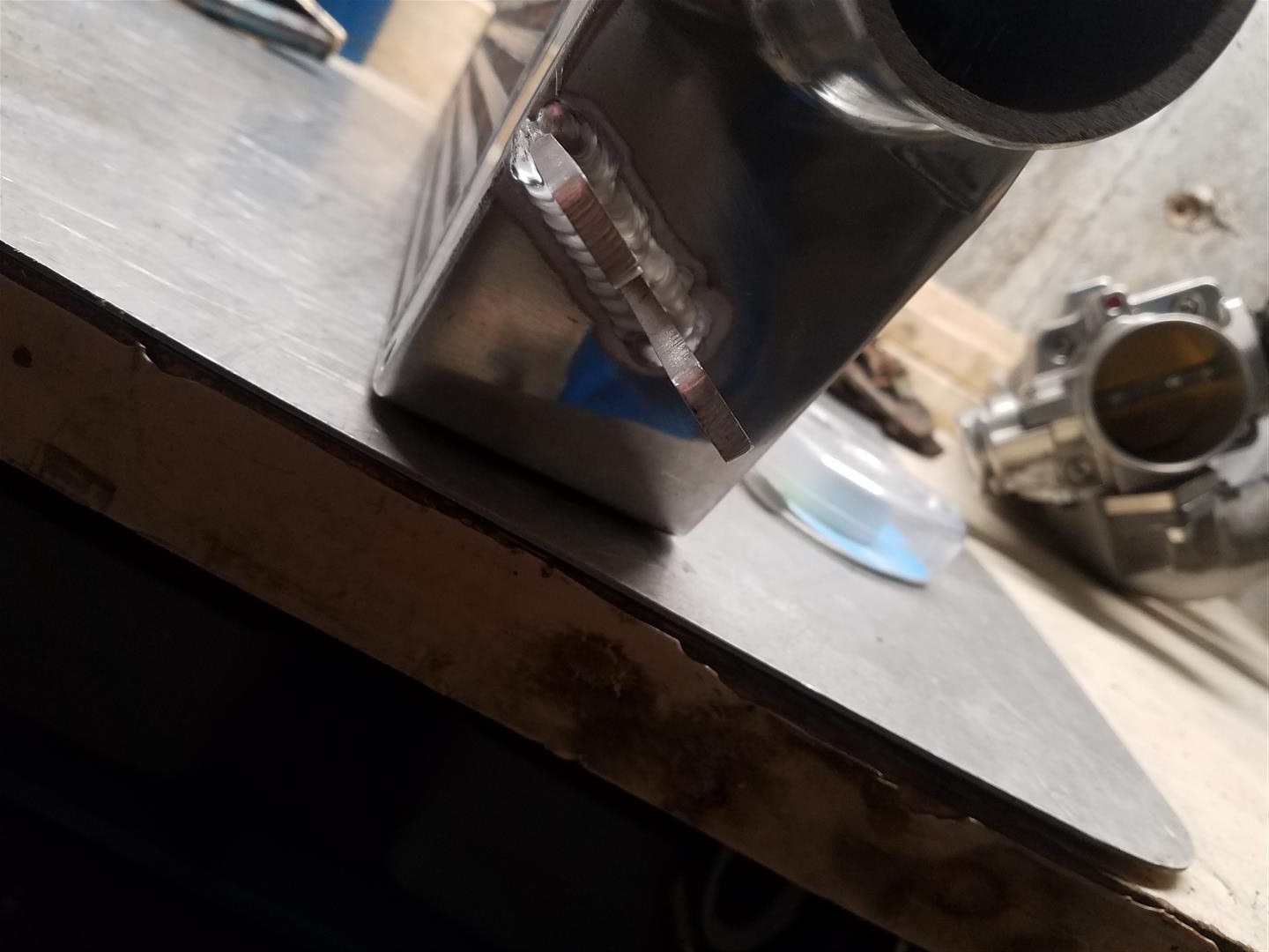 Now stick the weldnut in, while being upside down hold it with one hand and tack it in place. this can be a bitch so idk take your time or something. I was tig welding so it was an extra bitch. BTW i cant weld upside down, but whatever it was on there. a grinder is tough to get in there but i have a small air one i got in there to clean it up.