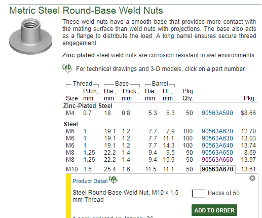 So getting to mounting it, I wanted to retain all the OEM weldnuts for the front teeth tow hooks. I picked up a set of these M10x1.5 weld in nuts from McMaster P/N 90563A670