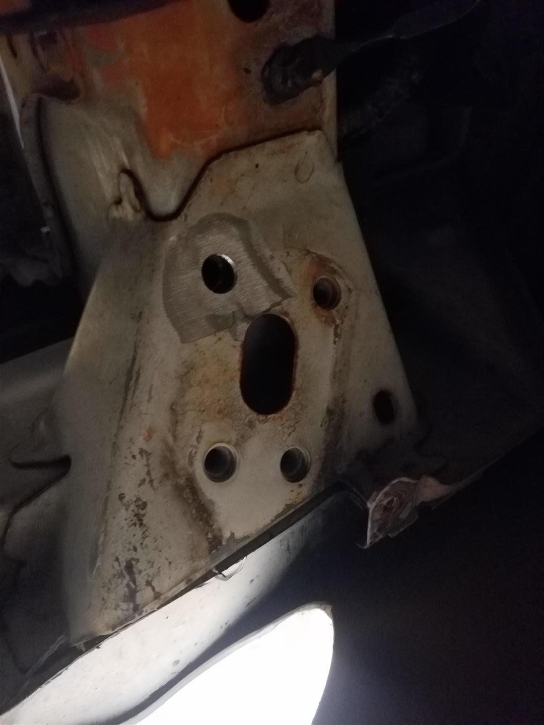 Now, if you get under the car, remove the OEM tow hooks or whatever you have or dont have, I should point out I dont have A/C and this wont work with A/C. You'll see 3 threaded holes and one not threaded hole. Take a 15/32" drill bit and open that hole up so the weldnut fits in nicely. and grind the paint off so you dont catch your car on fire and such. showing the passenger side here: