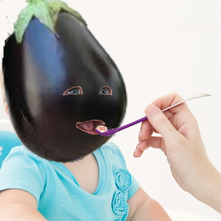 Somebody please photoshop that baby's head into an eggplant with lips being spoonfed an eggplant.