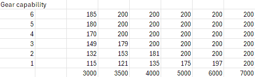 I haven't got my mapping laptop at the moment but have got the excel sheet I used for some of my calculations and it should give you an idea of what to go for. Running this EFR6758 0.64 with a max target of 200kPa (same as in the graph above), I also measured the boost threshold per gear and it looked like this.(X axis is RPM, Y axis is Gear and Z axis is the max achievable boost in a pull, forgive the formatting, it's from a calculation sheet). Being autocross, I guess first, second and third are the main ones you want to have mapped well, and you can see the response is very different....