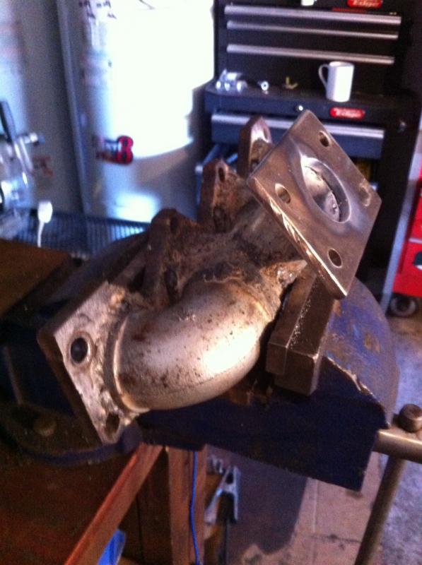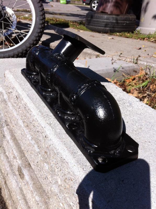 The flange to mate the turbo is just a 1/4" steel plate. Drilled it with a hole saw, 4 holes for the bolts and welded it on the manifold tube.