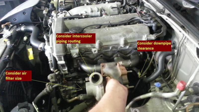 Keep in mind future turbo upgrade size, and choose a location for the turbo, in this case Im going with side mount as discussed with the owner, it keeps it easy to work on, can be covered with a heatshield, and allows a lot of room for a T28 later.