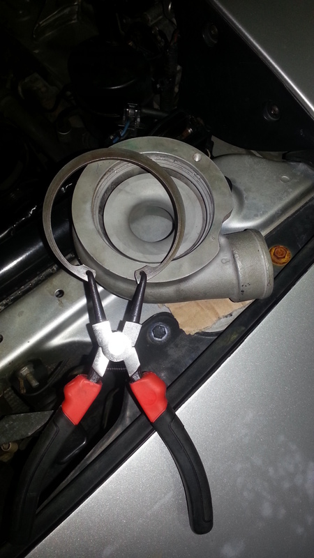 Take your circlip pliers and remove this circlip on the front housing, T25/28 have 6 bolts instead of the circlip.