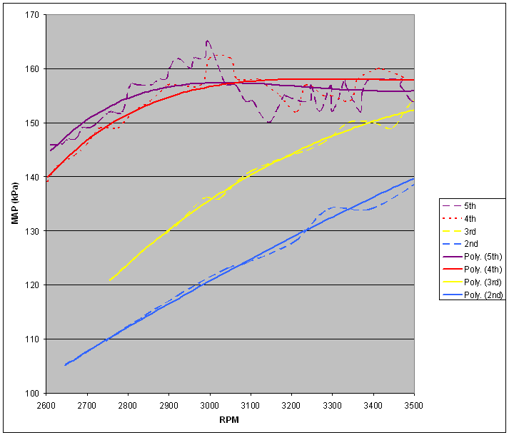 I expected to see slower build in lower gears of course, but the effect is more than I thought it would be. Here is the resulting graph submitted for your consideration. I have added trend lines since the 5th and 4th gear data are noisy. The trend is pretty clear, especially in the lower gears.