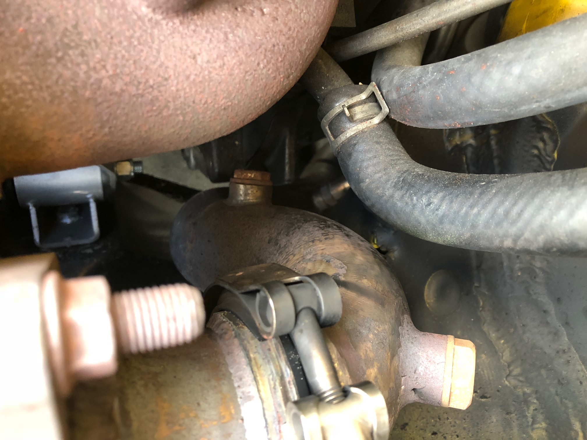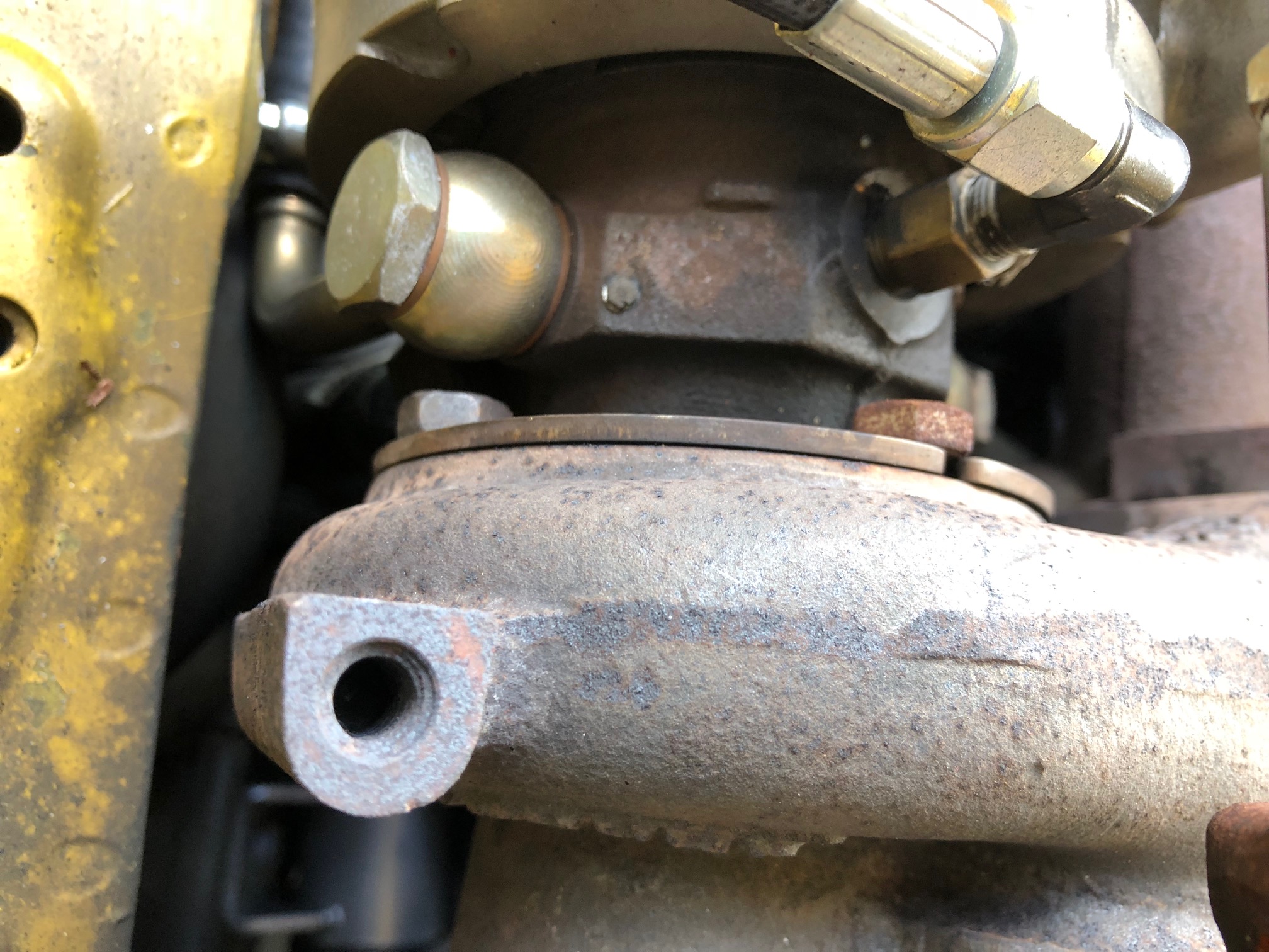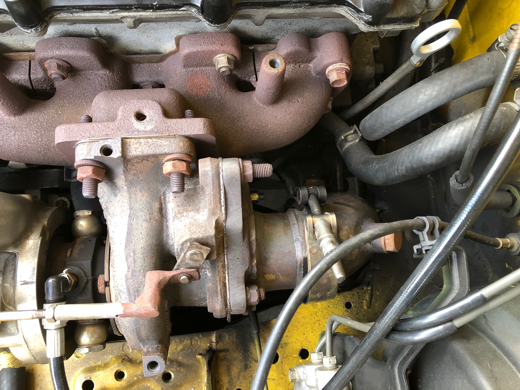So ebay manifold, probably an ebay turbo as well. It needed the internal wastegate adapter (again probably ebay) to avoid an external wastegate, which I think makes it a T3 turbo. If the upper two bolts are ~3" apart, it's a t25, if they're ~3.4", it's a t3. DP doesn't look terrible, looks like a cut shelf so all custom.