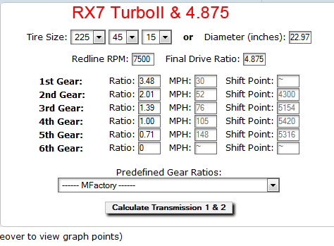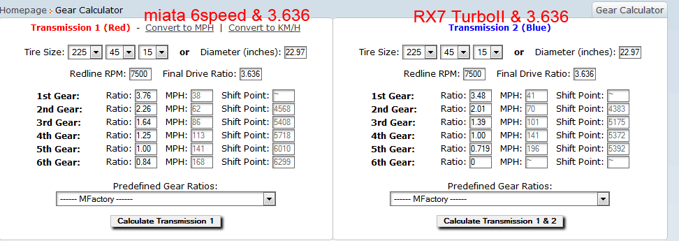 Looking at the gear ratio's, the RX7 transmission matted up to a 4.3 rear end wouldn't be a bad option at all. Now if you had a Miata that came with the 6 speed 3.909 rear end it would be pretty steep gearing!