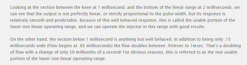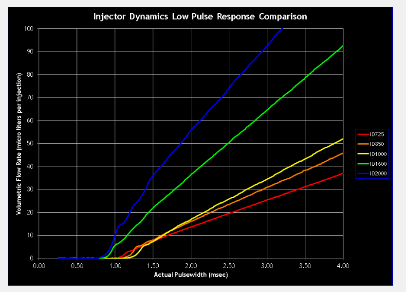 Having this ability has allowed us to steer customers in the right direction knowing nothing more than engine displacement. It has also allowed us to sort the good from the bad insuring that everything we release is a quality piece. By examining the flow vs pulse width curves of any injector we can answer important questions such as “Will this injector provide a stiochiometric idle on a 1.8 liter Honda engine?” “Or a 1000cc 4 cylinder motorcycle engine?”