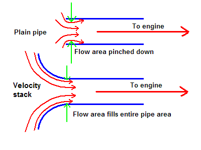 Notice the smaller unrestricted flow CSA (cross sectional area) in the top image. this same effect happens at the base of the velocity stack although it is not shown in the picture. The tapered runner helps combat the effects of this turbulence.