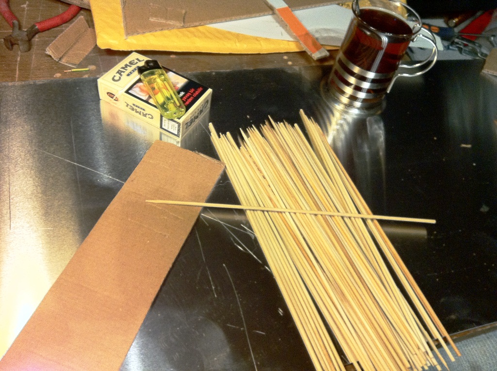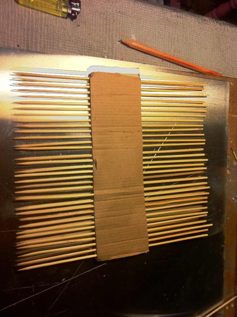 Next, cut a strip of the corrugated cardboard and stick the bamboo skewers through the grooves/holes/openings of the cardboard.