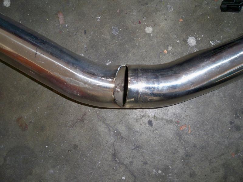 For a temporary set-up to build something I could drive to the muffler shop with, I took a pie cut out of the downpipe so we could bend it to make it stop hitting the frame. For as bad the welds were, the steel is actually pretty thick and durable, we had a hard time getting it to bend and ended up making a much larger pie cut than this.