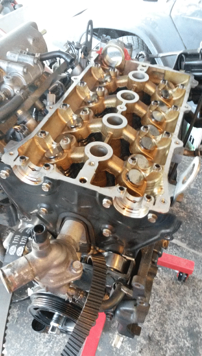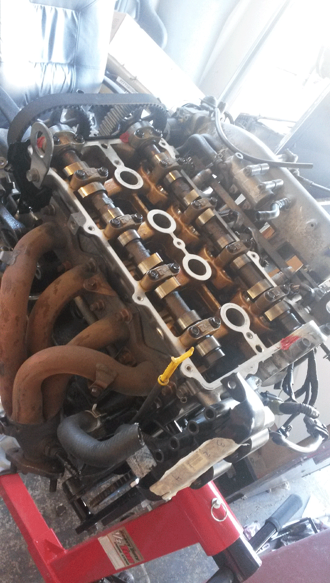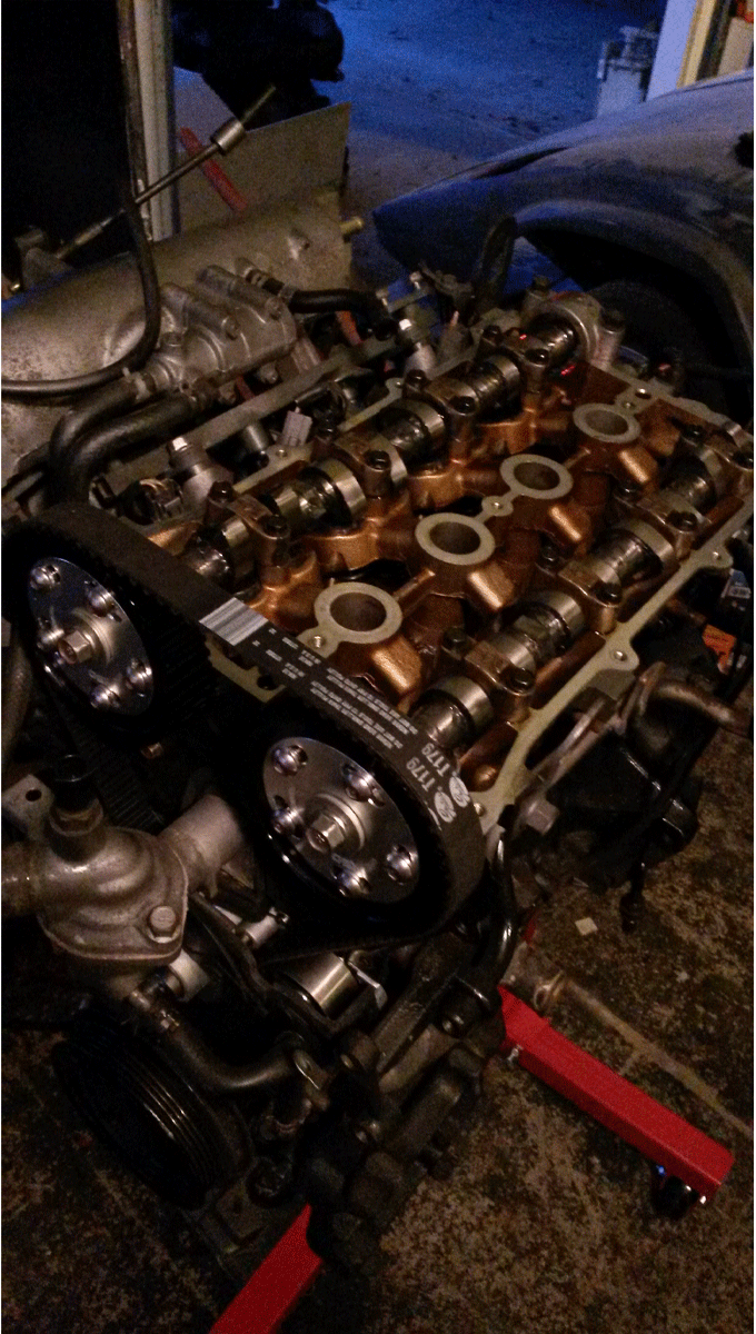 Got the adjustable cam gears from OBX. Toyota used OBX at one point, so i figured i would give them a try also. pulled out the old cams, cam gear, and cleaned the Hydraulic Lifters Lash Adjusters (or whatever they are called) and replaced them with the for mentioned parts. It got dirty, took some time, about 8 hours. Most of that was trying to figure out how to put cams in without bending anything. Rotated the engine a few times by hand to make sure it was back together properly. Checked the book to reassure myself I was doing this right. Had a good time. anyway here are the picts. you can flame now